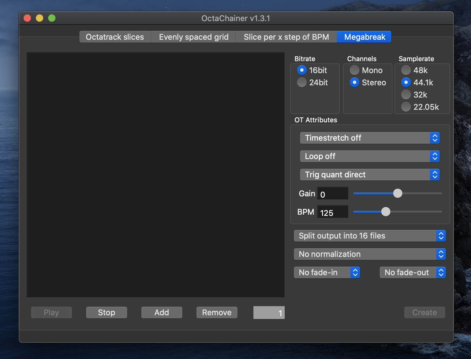 • Allows more than 64 octatrack slices. Instead, it will now give a warning that more than one .wav file will be created.